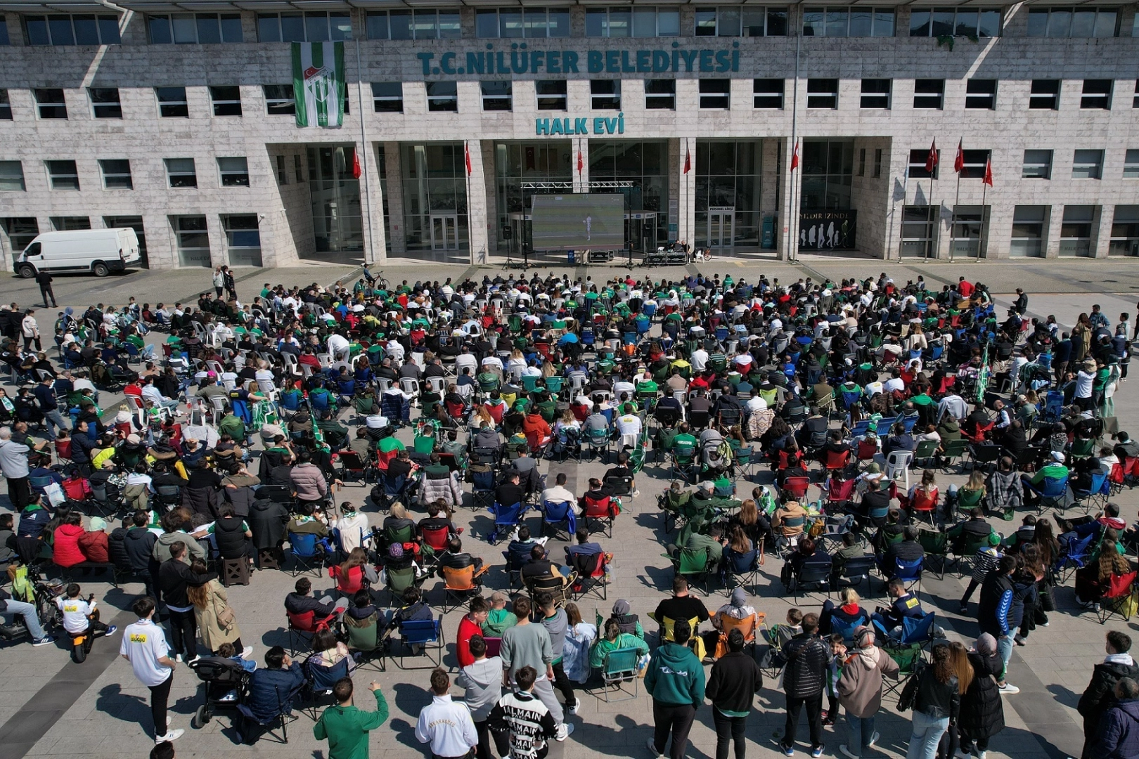 Bursaspor’un TFF 3. Lig 1. Grup’ta Artvin Hopaspor’u 2-1 mağlup ettiği karşılaşma, Nilüfer Belediyesi’nin organizasyonuyla Nilüfer Belediyesi Halk Evi önündeki Cumhuriyet Meydanı’nda dev ekranda yayınlandı. “Formanı Giy, Sandalyeni Kap Gel” sloganıyla düzenlenen etkinlik, yüzlerce taraftarı bir araya getirdi.