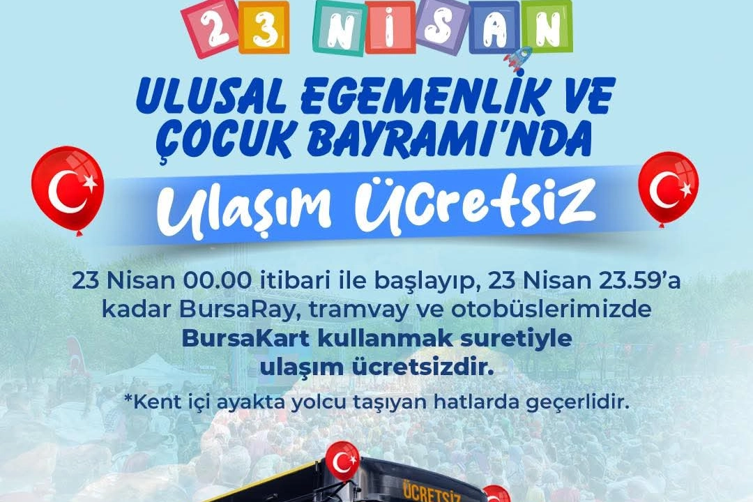 Bursa Büyükşehir Belediyesi, 23 Nisan Ulusal Egemenlik ve Çocuk Bayramı kutlama ve etkinliklerinin coşkulu kalabalıklarla yapılabilmesi için kent içinde ayakta yolcu taşıyan BursaRay, tramvay ve otobüs hatlarının 23 Nisan günü 00.00 ile 23.59 saatleri arasında BursaKart kullanmak suretiyle ücretsiz olarak hizmet vereceğini açıkladı.