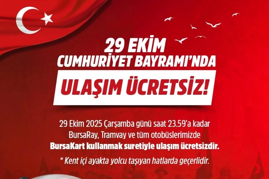 Bursa Büyükşehir Belediyesi, Cumhuriyet Bayramı kutlama ve etkinliklerinin coşkulu kalabalıklarla yapılabilmesi için 29 Ekim Çarşamba günü saat 23.59’a kadar BursaRay, tramvay hatları ve tüm otobüslerde BursaKart kullanmak suretiyle ulaşımın ücretsiz olacağını açıkladı. Uygulama, kent içi yolcu taşınan hatlarda geçerli olacak.