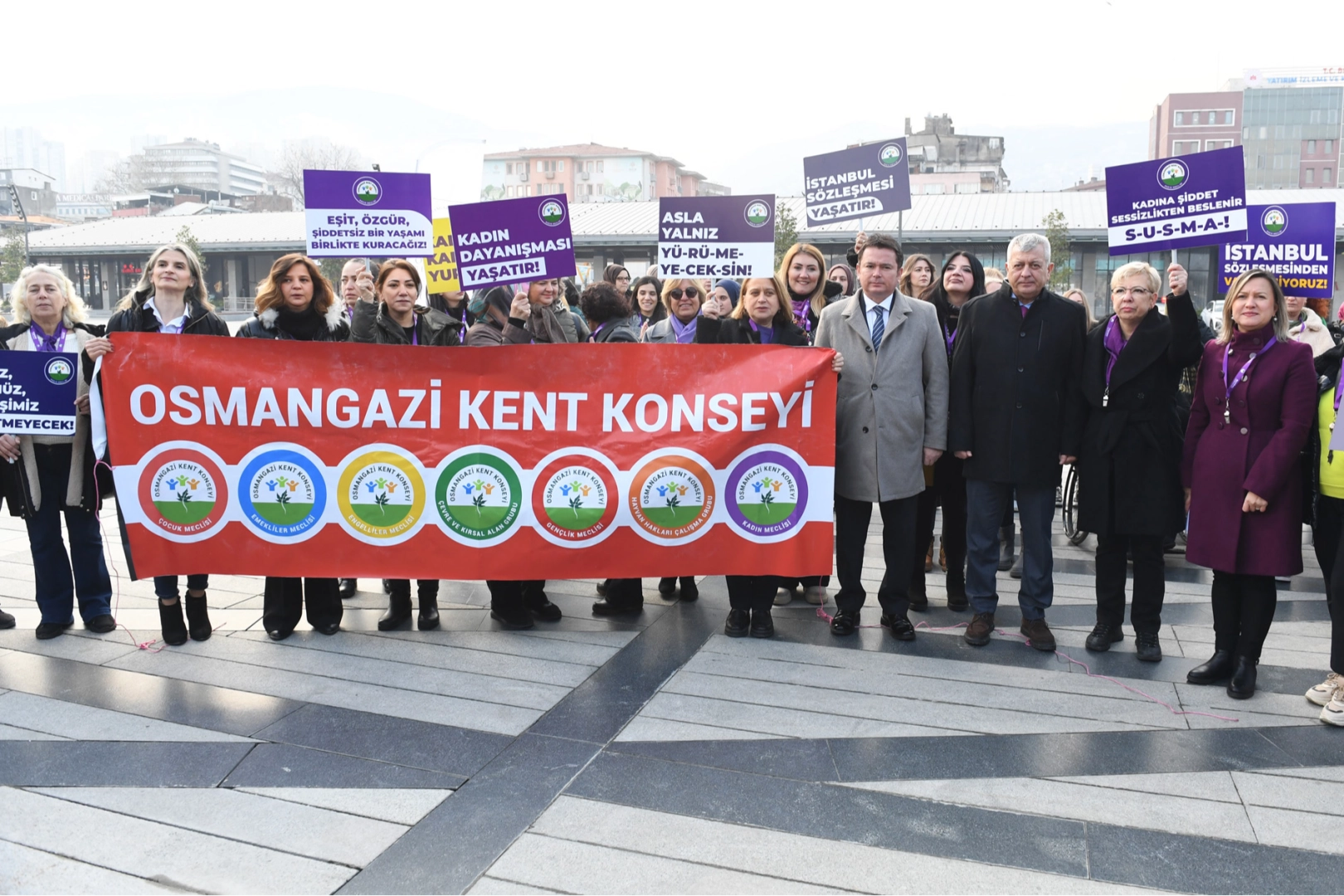Kadına yönelik şiddetle mücadele konusunda toplumsal farkındalık oluşturmanın hedeflendiği basın açıklamasında, ‘eşit, özgür, şiddetsiz bir yaşamı birlikte kuracağız’ mesajı verildi. Osmangazi Meydanı’nda düzenlenen basın açıklamasına Osmangazi Belediye Başkanı Erkan Aydın, Osmangazi Kent Konseyi Başkanı Fatma Çil Yılmaz, Osmangazi Kent Konseyi Kadın Meclisi Başkanı Sevgi Baysal, belediyedeki kadın personeller ile kadına yönelik şiddete dur diyen onlarca kadın katıldı.