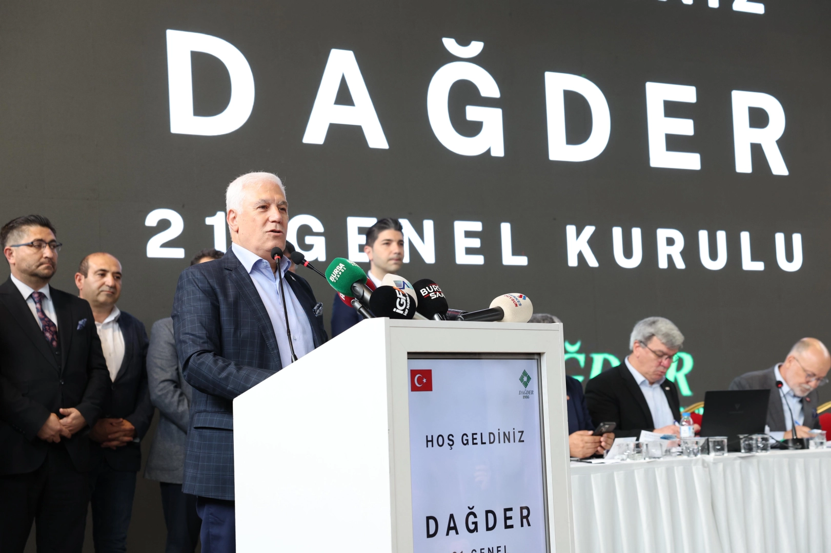 Bursa’nın en büyük sivil toplum kuruluşlarından birisi olan DAĞDER’in 21. Dönem Olağan Genel Kurulu, Atatürk Kültür Merkezi Merinos Yerleşkesi’nde yapıldı. Yaklaşık 20 bin üyesi bulanan DAĞDER’in genel kuruluna, Bursa Büyükşehir Belediye Başkanı Mustafa Bozbey de katıldı. Dağ bölgesi kökenli BESAŞ Yönetim Kurulu Başkanı Mustafa Orkun Gazioğlu, BURULAŞ Genel Müdürü Fahrettin Beşli, Tarım Peyzaj AŞ Genel Müdürü Sedat Akar, Jeotermal AŞ Genel Müdürü Erman Aydıngün, BUSKİ Özel Kalem Müdürü Mustafa Gazioğlu ve Dağ Yöresi Koordinatörü Ersin Yaşar ile birlikte sahneye çıkan Başkan Mustafa Bozbey, genel kurulun hayırlı olmasını diledi.