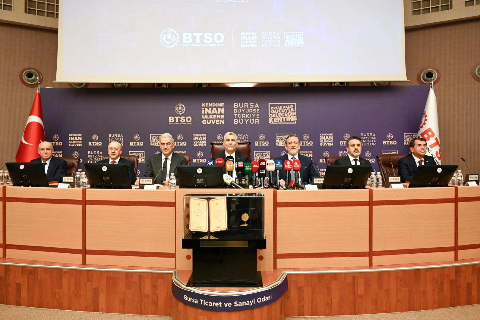 Bursa Ticaret ve Sanayi Odası (BTSO) Nisan Ayı Meclis Toplantısı, BTSO Ana Hizmet Binası’nda gerçekleşti. Toplantının ardından Ticaret Bakanı Prof. Dr. Ömer Bolat, Bursa Valisi Erol Ayyıldız, Bursa Büyükşehir Belediyesi Başkan Vekili Şahin Biba ve BTSO Yönetim Kurulu Başkanı İbrahim Burkay, iş dünyası temsilcileriyle bir araya geldi. Bursa’nın üretim, ticaret ve ihracattaki faaliyetlerinin değerlendirildiği toplantıda, şehri daha ileri taşımak amacıyla istişarelerde bulunuldu.