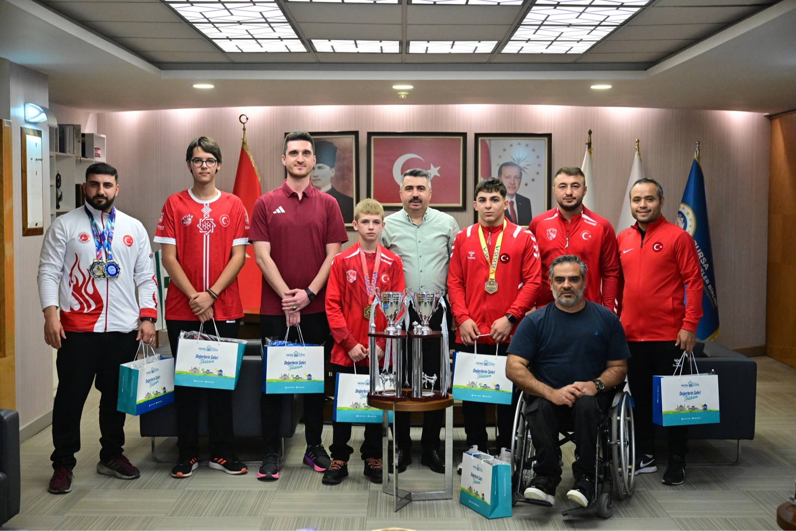 Katıldıkları uluslararası turnuvalarda ülkemizi ve Yıldırımı gururlandıran Toprak Aras, Yusuf İslam Kara, Batın Naniş ve Enes Gezer’i makamında ağırlayan Yıldırım Belediye Başkanı Oktay Yılmaz, başarılı sporcuları tebrik etti. Yıldırım’ın spor kenti kimliğini güçlendirmek için çalıştıklarını vurgulayan Başkan Oktay Yılmaz; “Gerek tesisleşme hamlemiz gerekse de spor kurslarımız ve eğitimlerimizle Yıldırım’ı adeta bir spor kentine çevirdik. Hamdolsun bu yatırımlarımız da meyvelerini veriyor. Sporcularımız katıldıkları ulusal ve uluslararası turnuvalarda ülkemizi ve bizleri gururlandıran önemli başarılara imza atıyorlar. Bu başarılar eminim ki, çocuklarımıza ve gençlerimize ilham olacak bir yol açacaktır. Ben tüm sporcularımızı tebrik ediyor ve başarılarının devamını diliyorum. Spora ve sporcuya olan desteğimiz bundan sonra da artarak devam edecek ifadelerini kullandı.