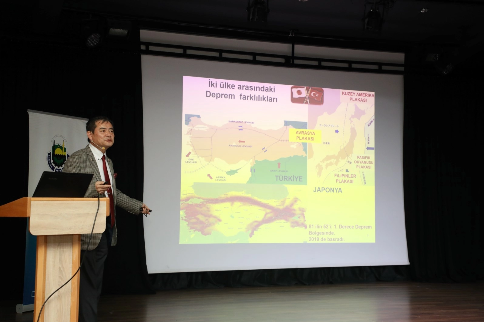Türkiye’de 81 ilin 52’sinin 1. Derece deprem bölgesi olduğunu ifade eden Moriwaki, “Türkiye’de Kuzey Anadolu Fay Hattı, Doğa Anadolu Fay Hattı ve Batı Anadolu fay hattı var. Doğa Anadolu Fay Hattında uzun süredir deprem yoktu. Türkiye aynı Japonya gibi deprem ülkesi ama Japonya gibi çok fazla deprem yok. Büyük deprem Türkiye’de 1939 Erzincan 7,9 olarak yaşandı. Japonya’da 2011 yılında 9,1 deprem yaşandı. 8 ve 9 derecelerindeki depremlere baktığımızda rakamsal olarak bir kat sayı ancak güç olarak bakıldığında 32 kat daha fark olduğunu görüyoruz. Dünya’da en büyük deprem Şili’de oldu 9,5 büyüklüğünde. 10 şiddetine kadar da olabilir diye öngörülüyor. Ancak çok düşük ihtimal” dedi.