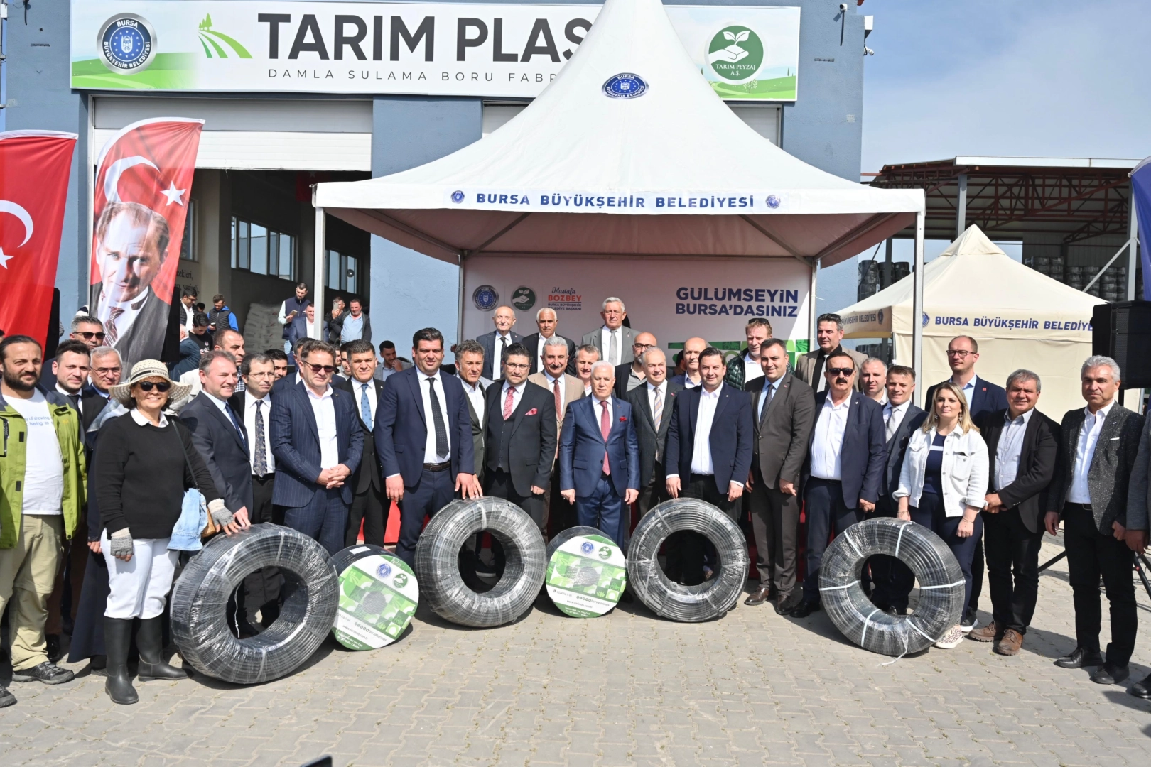 Bursa Büyükşehir Belediyesi Kırsal Hizmetler Dairesi Başkanlığı ile Tarım Peyzaj AŞ iş birliğinde yürütülen ‘Hibeli Damla Sulama Boru Projesi’ kapsamında toplam 10 bini aşkın sulama borusu, düzenlenen törenle yaklaşık 1500 çiftçiye teslim edildi. Mustafakemalpaşa Ovaazatlı Mahallesi’ndeki Damla Sulama Boru Üretim Tesisi’nde düzenlenen programa, Büyükşehir Belediye Başkanı Mustafa Bozbey, CHP İl Başkanı Nihat Yeşiltaş, CHP Bursa Milletvekili Orhan Sarıbal, Büyükşehir Belediyesi Genel Sekreteri Doç. Dr. Ergül Halisçelik, Mustafakemalpaşa Belediye Başkanı Şükrü Erdem, Büyükşehir Belediyesi Genel Sekreter Yardımcısı Mehmet Tözün Bingöl, Tarım Peyzaj AŞ Yönetim Kurulu Başkanı Mehmet Aydın Saldız, Tarım Peyzaj AŞ Genel Müdürü Sedat Akar, Büyükşehir Belediyesi yöneticileri, meclis üyeleri, ziraat odalarının yöneticileri, muhtarlar ve üreticiler katıldı.