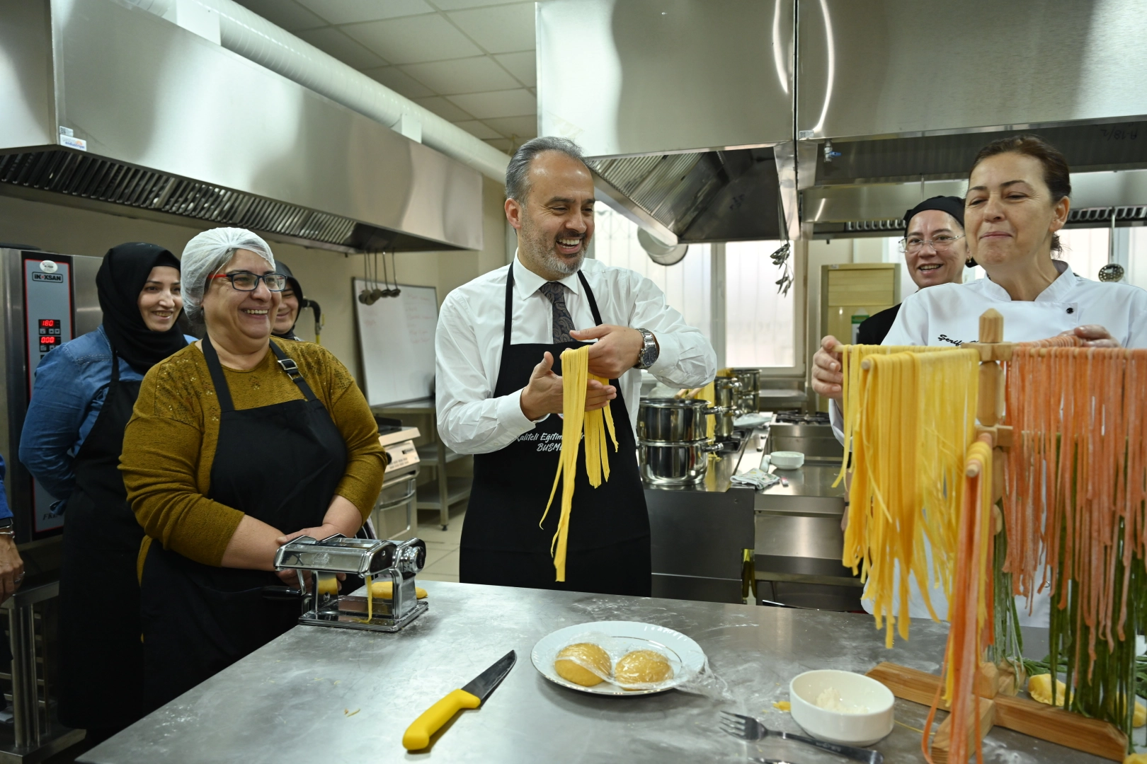 Program sonunda eğitim sınıflarını gezen Başkan Alinur Aktaş, önlük giyerek mutfaktaki hünerlerini sergiledi. Kursiyerlerle birlikte el yapımı makarna ve yaş pasta yapan Başkan Aktaş, daha sonra yaptığı ürünleri kursiyerlere ikram etti.