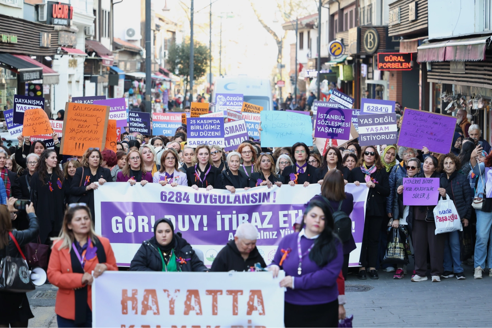 Bursa’da binlerce kadın 25 Kasım Kadına Yönelik Şiddete Karşı Uluslararası Mücadele Günü’nde kadın haklarını savunmak, şiddetsiz bir yaşam, adalet ve eşitlik için sokaklara çıkarak sloganlar eşliğinde yürüyüş yaptı.