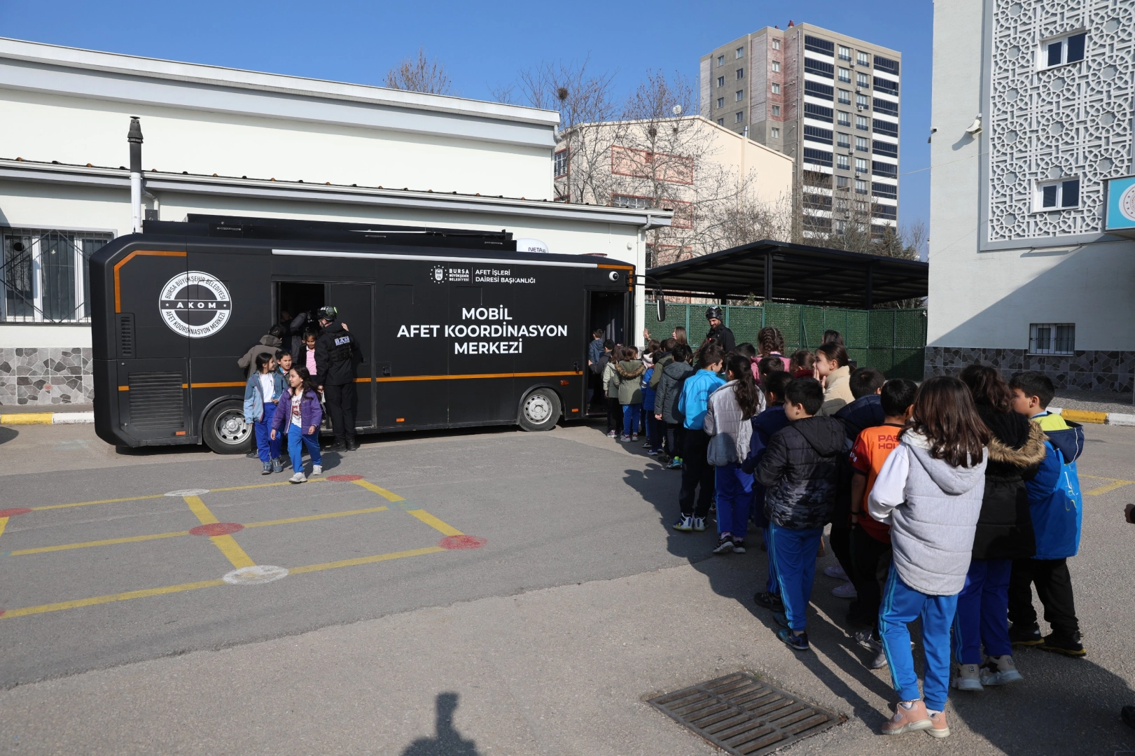 Okul genelinde gerçekleştirilen deprem tatbikatında öğrenciler ve personel, siren uyarısıyla çök-kapan-tutun hareketini uyguladı. Ardından okul binasını kontrollü şekilde tahliye edildi. Arama kurtarma köpeği Tipo’nun yaptığı gösteri, çocuklar tarafından ilgiyle takip edildi. Daha sonra Bursa Büyükşehir Belediyesi’nin Mobil Afet Koordinasyon Aracı’na geçen öğrenciler, çalışmalar hakkında bilgilendirildi.