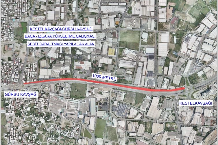 Bursa Büyükşehir Belediyesi Ulaşım Daire Başkanlığı tarafından Kestel Kavşağı ile İhtisas Kavşağı arasında ızgara baca yükseltme işlemleri yapılacaktır. Çalışmalar kapsamında bu geceden (27 AĞUSTOS) itibaren yaklaşık 10 GÜN boyunca 22.00-06.00 saatleri arasında şeritler daraltması yapılacaktır. İlk etap çalışmaları Kestel Kavşağı ile Gürsu Kavşağı arasında yapılacaktır. Sürücülerin trafik işaret ve levhalarına uymaları gerekmektedir.