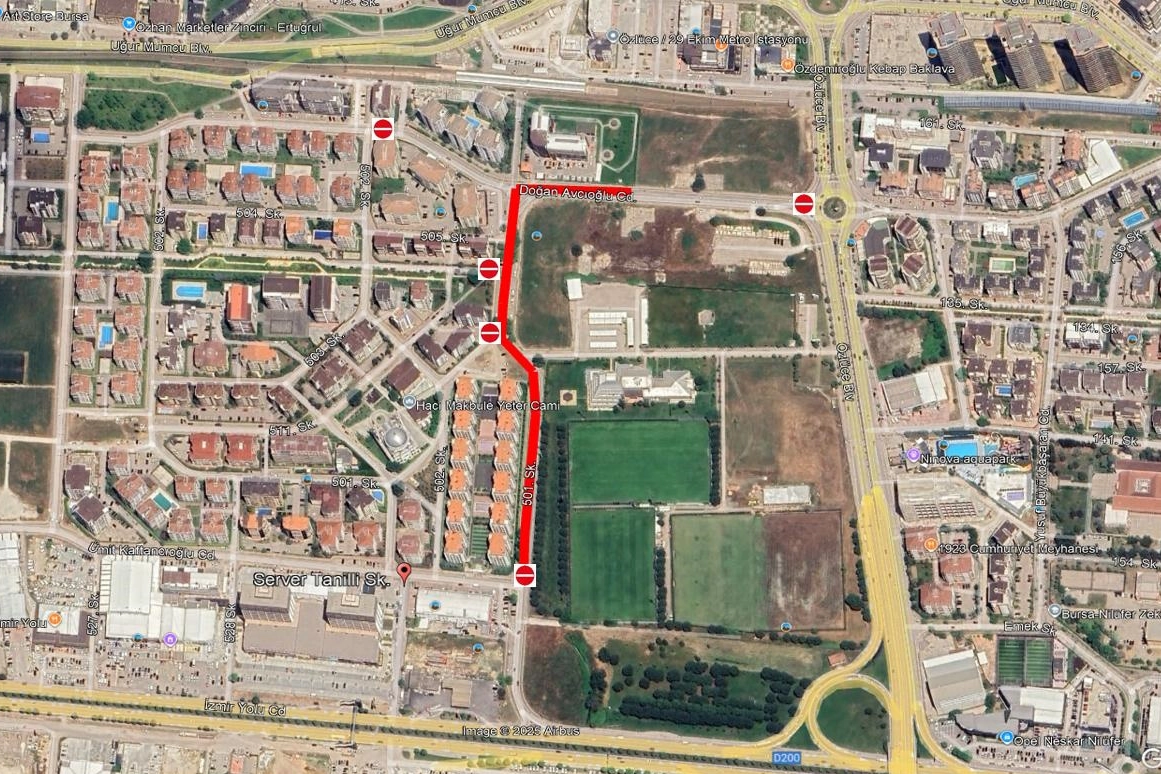 BUSKİ Genel Müdürlüğü Kanalizasyon Dairesi Başkanlığı tarafından yapılacak çalışmalar kapsamında Nilüfer İlçesi 29 Ekim Mahallesi Doğan Avcıoğlu Caddesi üzerinde 07 Ocak 2026 – 15 Ocak 2026 tarihleri arasında yağmur suyu deplase imalatı yapılacaktır. Söz konusu imalatların güvenli ve sağlıklı bir şekilde gerçekleştirilebilmesi amacıyla gerekli trafik izinleri alınmış olup, çalışma süresince Doğan Avcıoğlu Caddesi araç trafiğine kapatılacaktır. Çalışmalar süresince sürücülerin trafik işaret ve işaretçilerine uymaları gerekmektedir.