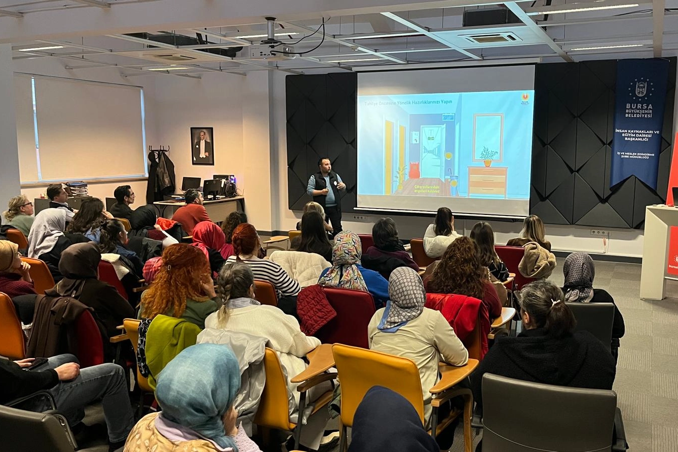 Bursa’yı daha dirençli, daha güvenli ve yaşanabilir bir kent haline getirmek amacıyla katılımcı bir anlayışla çalışmalarını sürdüren Bursa Büyükşehir Belediyesi, çalışanlarına yönelik farkındalık eğitimlerine devam ediyor. Bu kapsamda Afet İşleri ve Risk Yönetimi Dairesi Başkanlığı tarafından, İş ve Meslek Edindirme Şube Müdürlüğü personeline yönelik “Afet Farkındalık Eğitimi” düzenlendi. Eğitim programında, başta deprem olmak üzere sel ve su baskını gibi doğal afetlerde doğru hareket tarzları ele alındı. Ayrıca afet öncesi, afet sırası ve sonrasında doğru davranış biçimleri, uzmanlar tarafından kapsamlı şekilde aktarıldı.