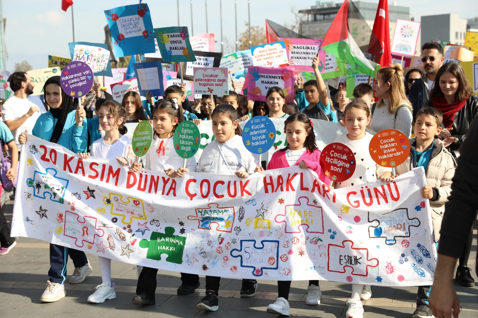Birleşmiş Milletler tarafından 20 Kasım 1989 yılından bu yana çocukların karşı karşıya kaldığı hak ihlallerine dikkat çekmek amacıyla düzenlenen Dünya Çocuk Hakları Günü, Bursa’da da renkli görüntüler eşliğinde kutlandı. Bursa Büyükşehir Belediyesi ve Bursa Kent Konseyi tarafından düzenlenen ‘2. Dünya Çocuk Hakları Festivali’ kapsamında yüzlerce anaokulu, ilkokul ve ortaokul öğrencisi, Kent Meydanı Atatürk Heykeli önünde buluştu. Çocuk haklarına dikkat çeken döviz ve pankartları taşıyan öğrenciler, bando takımı eşliğinde Atatürk Kültür Merkezi Merinos Yerleşkesi’ne kadar yürüdü. Merinos Yerleşkesi’nde kendileri için hazırlanan renkli atölyelere, sihirbazlık gösterilerine, yüz boyama etkinliklerine ve daha birçok eğlenceli aktiviteye katılan çocuklar, gün boyunca keyifli vakit geçirdi.