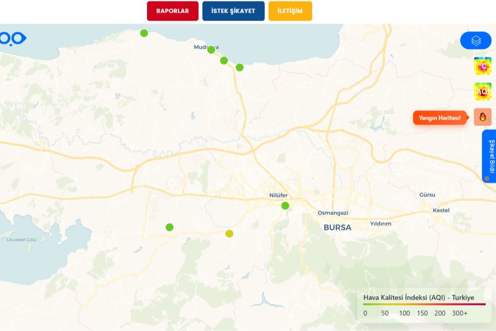 Çevre Koruma ve Kontrol Dairesi Başkanlığı tarafından geliştirilen sistemle, Bursa’daki ve Türkiye’deki tüm yangın noktaları online izlenebilecek. Büyükşehir Belediyesine ait https://www.bursa.bel.tr/hava-kalitesi adresine girenler, ateş ikonuna tıklayarak yangın noktalarını anlık görüntüleyebilecek.