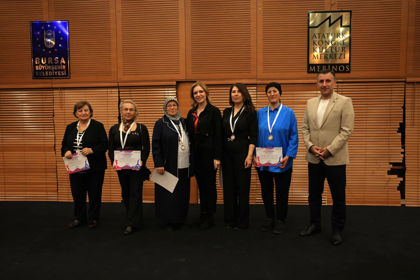 Bursa Büyükşehir Belediyesi tarafından düzenlenen ‘Zumba ve Pilates’ etkinliğine katılan kursiyerler, 12 haftalık eğitimin ardından sertifika heyecanı yaşadı.