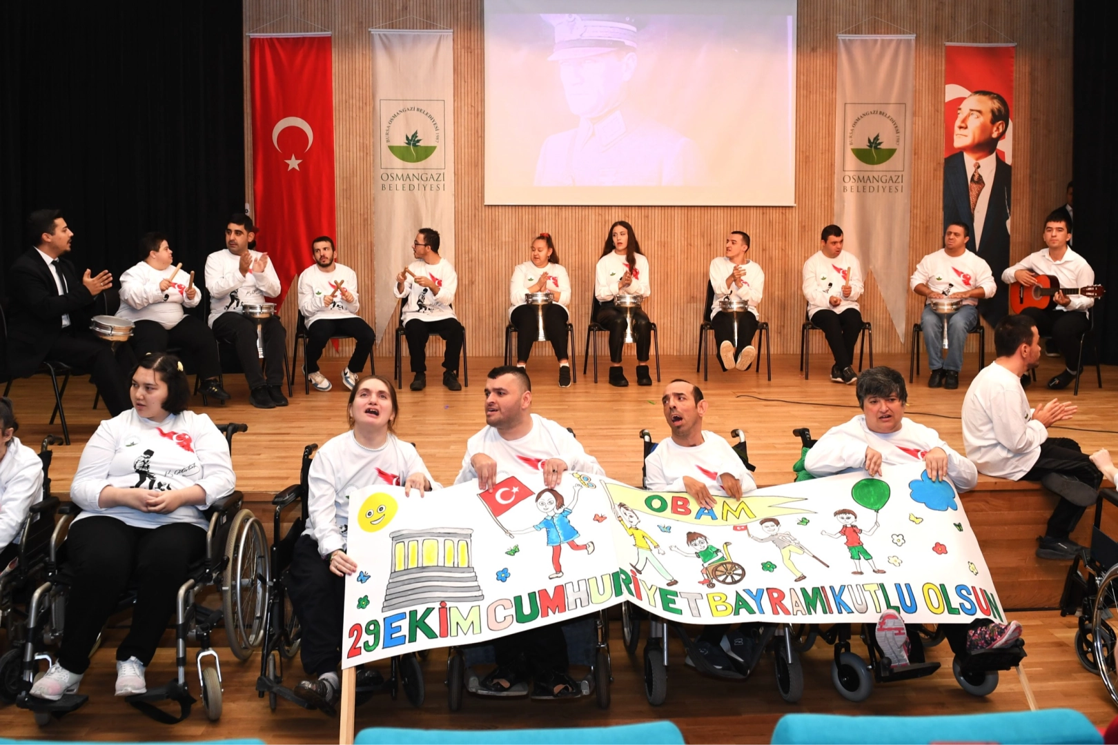 Türkiye Cumhuriyeti’nin 102’inci kuruluş yıldönümü için Osmangazi Belediyesi Engelli Bakım Merkezi (OBAM)'da eğitim gören özel gereksinimli öğrenciler, birbirinden özel gösteriler hazırladı. Osmangazi Gösteri Merkezinde düzenlenen kutlama etkinliğinde sahne alan özel öğrenciler, koro eşliğinde şarkılar söyleyip çeşitli gösteriler yaparak Cumhuriyetin 102’inci kuruluş yıldönümü büyük bir sevinç ve heyecanla kutladı. Engelli bireylerin yaptığı bir birinden özel gösteriler izleyenler tarafından büyük beğeni aldı. Düzenlenen kutlama etkinliğine Osmangazi Belediye Başkanı Erkan Aydın, belediye başkan yardımcıları, meclis üyeleri, öğrenciler ve vatandaşlar katıldı. Programa katılanlar engelli bireylerin söylediği coşkulu şarkılara alkışlarla ritim tutup eşlik ederek heyecanlarına ortak oldu.