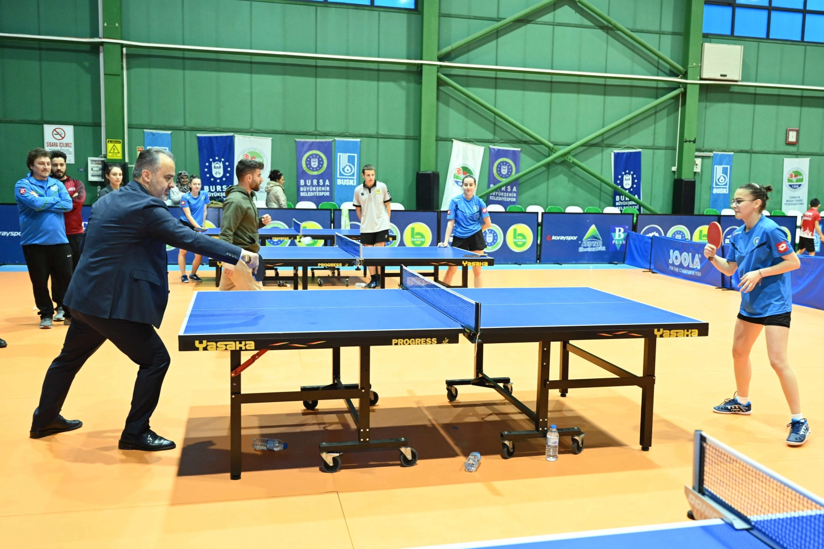 Bursa Büyükşehir Belediye Başkanı Alinur Aktaş da genç sporculara moral vermek için idman saatinde onları ziyaret etti. Sporcularla masa tenisi oynayıp, onlara baklava ikram eden Başkan Aktaş, “Acımız çok büyük ama bir taraftan da yaraları sarmaya çalışıyoruz. Depremzede kardeşlerimize sahip çıkma noktasında elimizden gelen gayreti ortaya koyuyoruz. Deprem bölgesindeki 5 ilden gelen 5 antrenör ve 20 lisanslı sporcumuzu Bursa’da misafir ediyoruz. Bizim sporcularımızla beraber onları diri tutmaya, acılarını biraz olsun hafifletmeye çalışıyoruz. Çocuklarımızın mutluluğunu ve heyecanını görmek beni mutlu etti. Onların acılarını dindirmek, moral vermek, yaralarını sarmak bizim en önemli görevimiz” dedi.