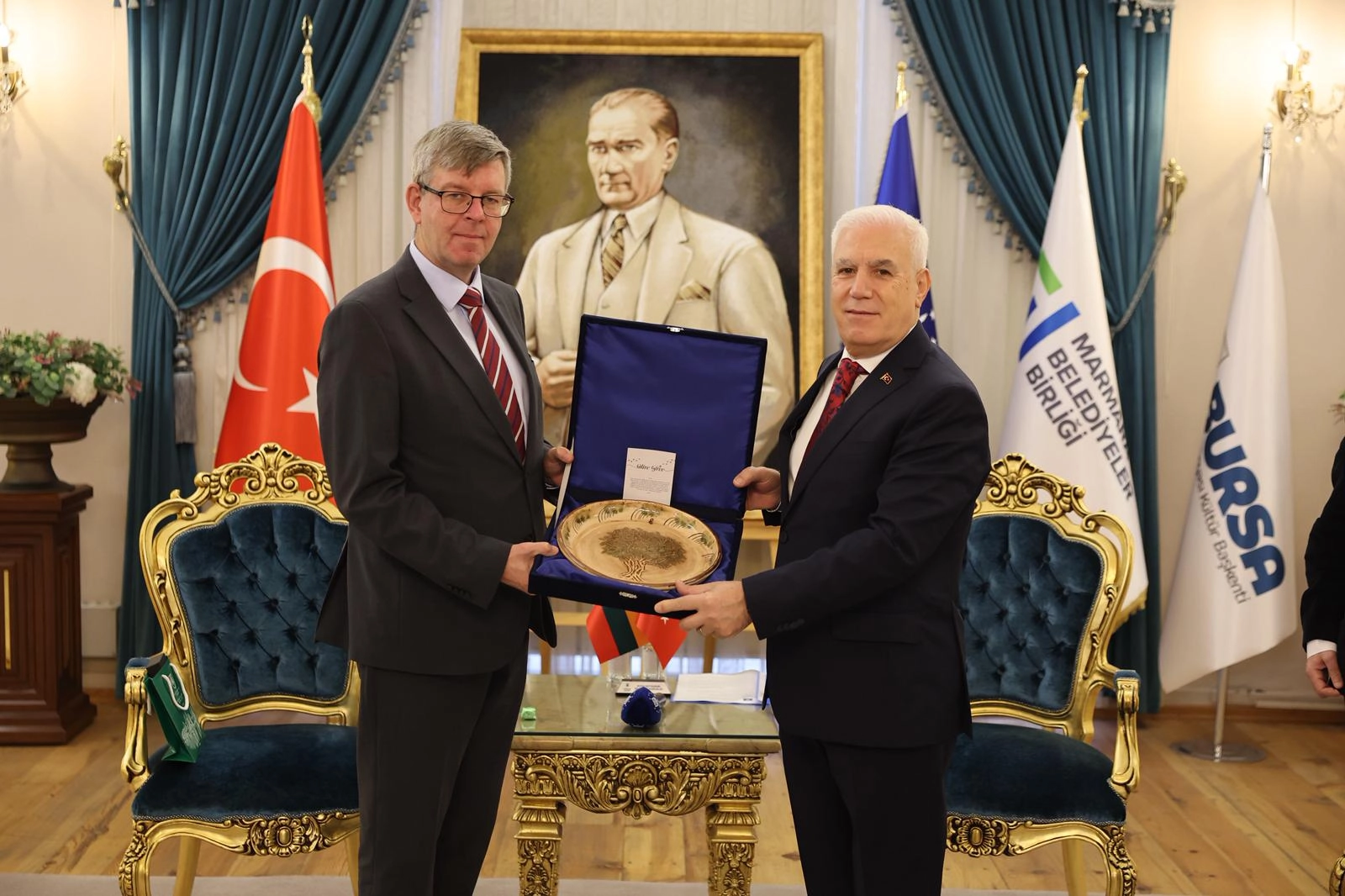 Litvanya Ankara Büyükelçisi Marius Janukonis, Misyon Şefi Yardımcısı Dalija Ignataviciute ve Litvanya Bursa Fahri Konsolosu Berat Tunakan’ı Heykel’deki Tarihi Belediye Binası’nda ağırlayan Başkan Mustafa Bozbey, konuklara Bursa’nın tarihi ve ekonomik potansiyeli hakkında bilgi verdi. Büyükşehir Belediyesi Genel Sekreter Yardımcısı Mehmet Emin Direkçi’nin de yer aldığı ziyarette, iki ülke arasındaki bağların kuvvetlendirilmesi ve ikili ilişkiler ele alındı.