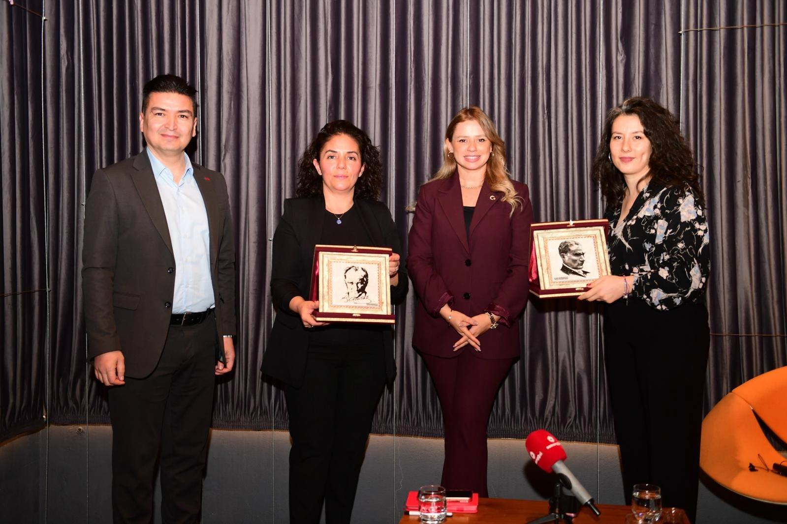 Söyleşinin ardından Osmangazi Belediyesi Basın Yayın ve Halkla İlişkiler Müdürü Süleyman Çavlı, Esra Türker ve Hatice Nur Derya’ya Atatürk plaketi takdiminde bulundu.