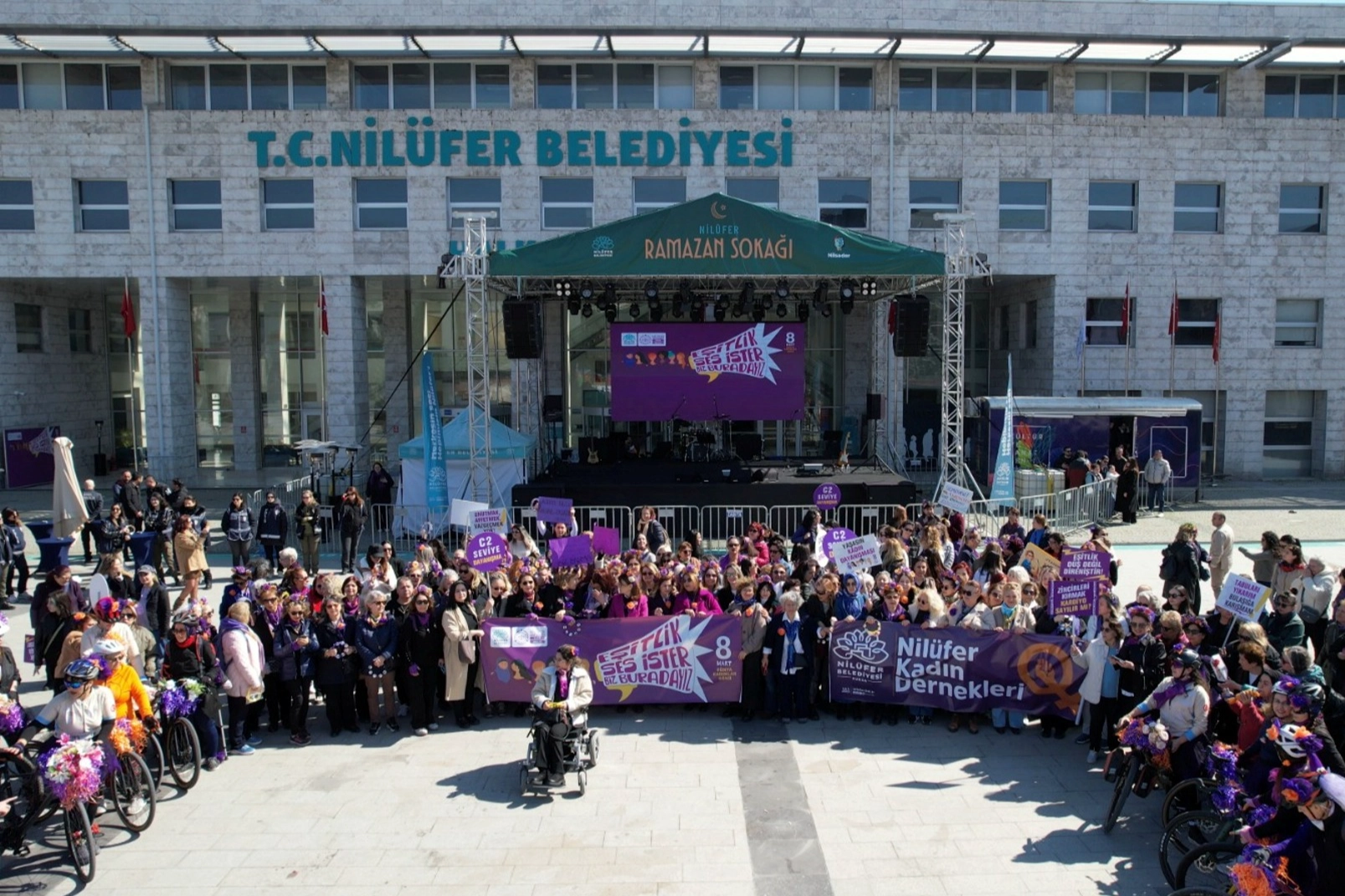 Nilüfer Belediyesi ve Nilüfer Kent Konseyi, 8 Mart Dünya Kadınlar Günü’nde geniş katılımlı bir yürüyüş ve basın açıklaması düzenledi. “Eşitlik Ses İster, Biz Buradayız” sloganıyla Nilüfer Kent Konseyi önünde başlayan yürüyüşte kadınlar, eşitlik ve direniş sloganları eşliğinde Nilüfer Belediyesi Halk Evi önündeki Cumhuriyet Meydanı’na kadar yürüdü. Etkinliğe, Nilüfer Belediye Başkan Yardımcıları Serpil Altun ve Bukle Erman ve meclis üyeleri ile Nilüfer Belediye Başkanı Şadi Özdemir’in eşi Nuray Özdemir de katıldı. Korteje, Nilüfer Kent Konseyi Bisiklet Çalışma Grubu da bisikletleriyle eşlik etti.