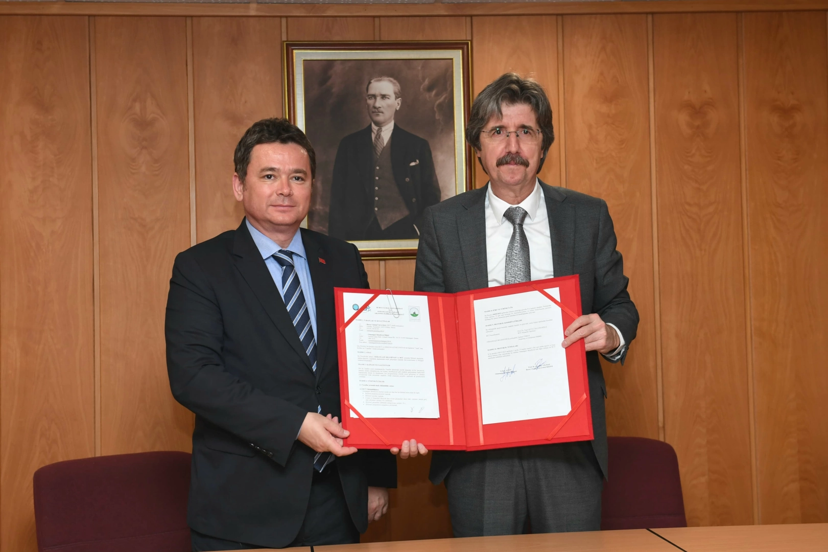 Bursa Uludağ Üniversitesi Rektörlük Binası’nda imzalanan protokolün ardından Osmangazi Belediye Başkanı Erkan Aydın ve Bursa Uludağ Üniversitesi Rektörü Prof. Dr. Ferudun Yılmaz, günün anısına birbirine hediye takdim etti.
