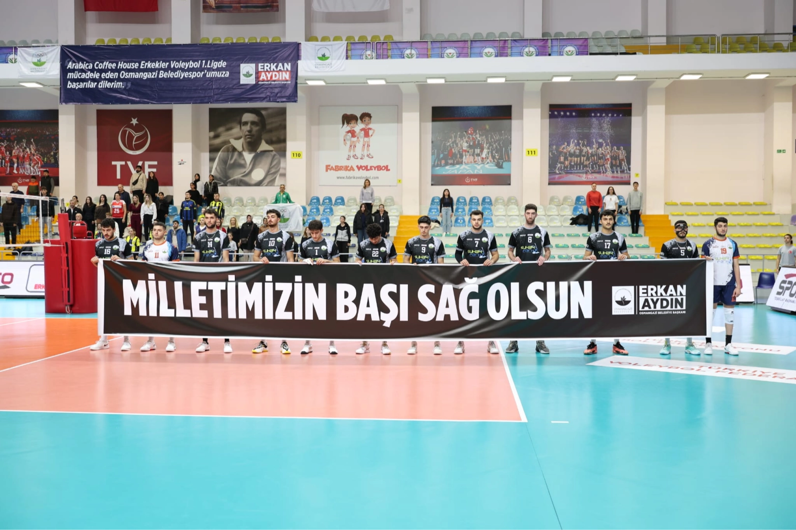 Karşılaşmaya “Milletimizin Başı Sağ Olsun” yazılı pankartla çıkan Osmangazi Belediyespor Erkek Voleybol Takımı, duyarlı davranışıyla taraftarın takdirini topladı.