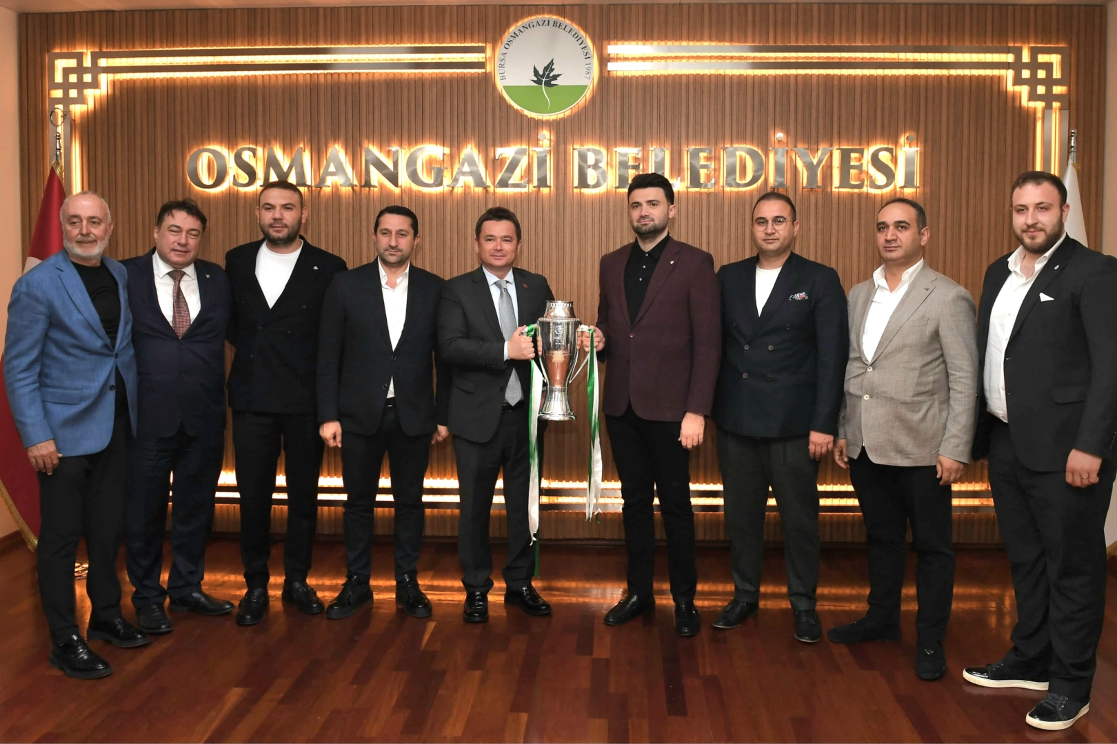 TFF 3. Lig 1. Grup’ta şampiyonluğunu ilan eden Bursaspor’un şampiyonluk kupasının bu defa ki durağı Osmangazi Belediyesi oldu. Osmangazi Belediye Başkanı Erkan Aydın, Bursaspor Başkanı Enes Çelik ve yönetim kurulu üyelerini başkanlık makamında şampiyonluk kupasıyla ağırladı. Başkanlar şampiyonluk kupasını beraber kaldırarak hatıra fotoğrafı çektirdi.
