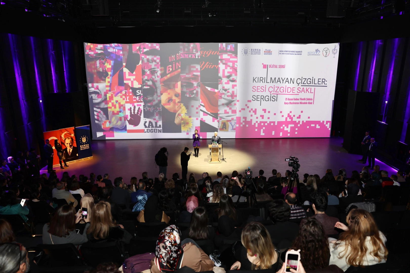Eşitliği ve şiddetten, ayrımcılıktan uzak bir gelecek idealini çalışmalarının merkezinde tutan Büyükşehir Belediyesi, toplumsal duyarlılığı ve sosyal belediyecilik vizyonunu yansıtan önemli bir etkinliğe daha imza attı. Zeki Müren Güzel Sanatlar Lisesi ile Feriha Uyar Mesleki ve Teknik Anadolu Lisesi öğrencilerinin sanatsal üretimlerinden oluşan “Kırılmayan Çizgiler: Sesi Çizgide Saklı” isimli dijital sergi, ‘25 Kasım Kadına Yönelik Şiddete Karşı Uluslararası Mücadele Günü’ kapsamında Bursalıların ziyaretine açıldı. 110 eserin yer aldığı dijital sergi, Büyükşehir Belediyesi tarafından ‘Fark Et, Oyna, Dönüştür’ teması ile gençler için düzenlenen atölye çalışmalarını dijital dünya ile buluşturdu. DasDas Bursa’da düzenlenen serginin açılış programına, Bursa Büyükşehir Belediye Başkanı Mustafa Bozbey ve eşi Seden Bozbey’in yanı sıra Aile ve Sosyal Politikalar İl Müdürlüğü ve Nilüfer İlçe Milli Eğitim Müdürlüğü yöneticileri, sivil toplum kuruluşlarının temsilcileri, öğretmenler ve öğrenciler katıldı.