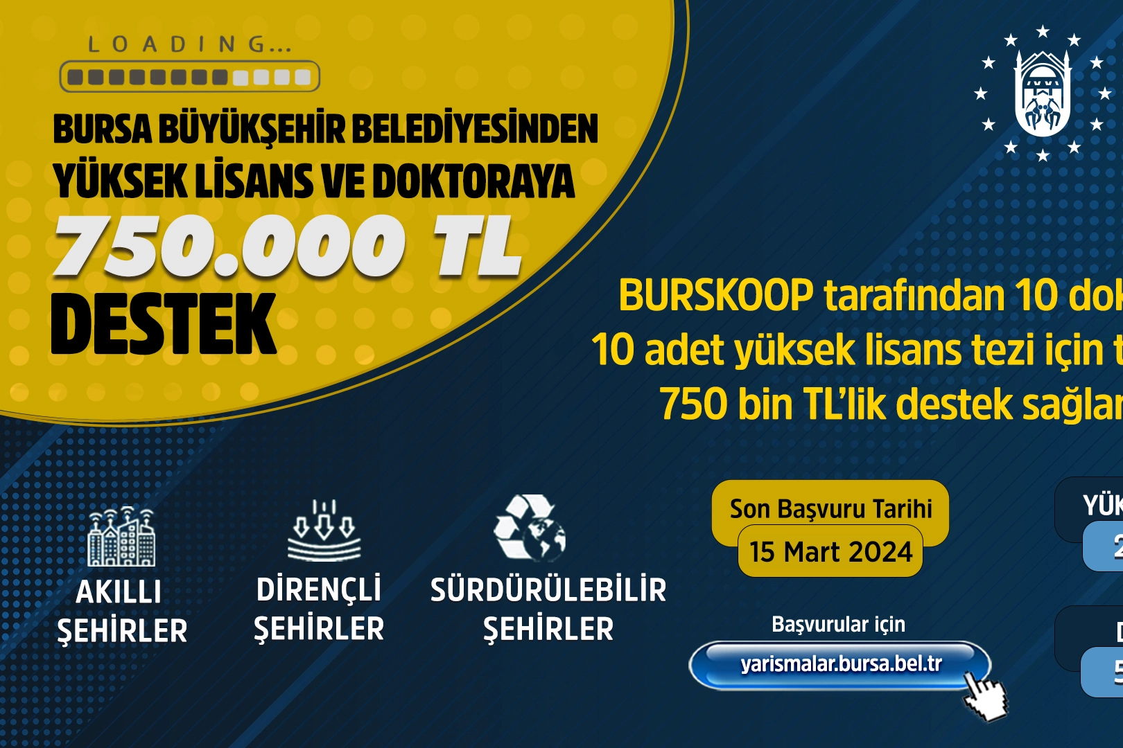 Bursa Büyükşehir Belediyesi tarafından ‘Akıllı şehirler, dirençli şehirler ve sürdürülebilir şehirler’ temasıyla bilimsel çalışmalara destek olmak amacıyla  ‘Lisansüstü Tez Destek Programı’ düzenlendi. Yüksek lisans ve doktora düzeyindeki çalışmaları desteklemek amacıyla toplam 750.000 TL’lik kaynağın ayrıldığı programa, Bursa’da eğitim gören veya şehre katkı sağlayacak projeler üreten birçok öğrenci başvuruda bulundu. Destek programıyla, doğal kaynakları koruyan, sürdürülebilir ve yenilikçi çözümler geliştiren projeler üretilmesi, bilimsel çalışmalarla Bursa’nın geleceğine yön verilmesi hedeflendi. Tez çalışmalarını Bursa ölçeğinde gerçekleştiren yüksek lisans ve doktora öğrencileri, kentin sorunlarına yönelik bilimsel, yenilikçi ve uygulanabilir çözümler getirmek için çalışmalar yürüttü. Büyükşehir Belediyesi tarafından kentin ihtiyaçlarına yönelik özgün ve yenilikçi çözümler üretilmesine katkı sağlamak amacıyla hazırlanan ‘Lisansüstü Tez Destek Programı’ndan destek almaya hak kazananlar da belirlendi. Program kapsamında destek almaya hak kazanan araştırmacıların listesine https://yarismalar.bursa.bel.tr adresinden ulaşılabilir.
