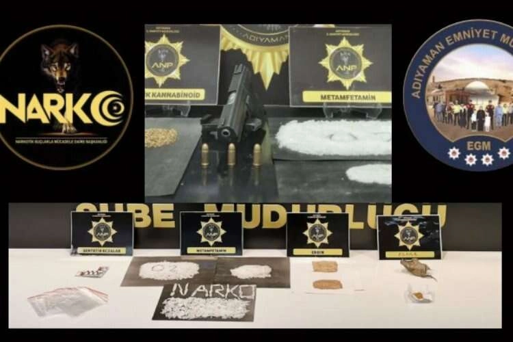 Uyuşturucu satıcıların ikametinde yapılan aramada; 64,21 gram Metamfetamin Maddesi, 95,96 gram Sentetik Kannabinoid Maddesi, 3,03 gram Skunk, Maddesi, 2,41 gram Esrar Maddesi, 0,72 gr Afyon Sakızı, 22 adet Sentetik Ecza, 4 adet kullanım aparatı puyp, 1 adet ruhsatsız tabanca, 1 adet Tabancaya ait adet şarjör, 9 adet tabancaya ait fişek, 1 adet tek kırma ruhsatsız av tüfeği, 1 adet kısa namlulu yivsiz tüfek, Tüfeklere ait 26 adet kartuş, 2 adet satır, 1 adet üstü tırtıklı av bıçağı, 1 adet bıçak, 1 adet kelebek bıçak, 1 adet sustalı bıçak, 2 adet alüminyum folyo rulosu, 1 adet sigara jelatin rulosu, 4220 TL ve 1 dolar Banknot ele geçirildi.