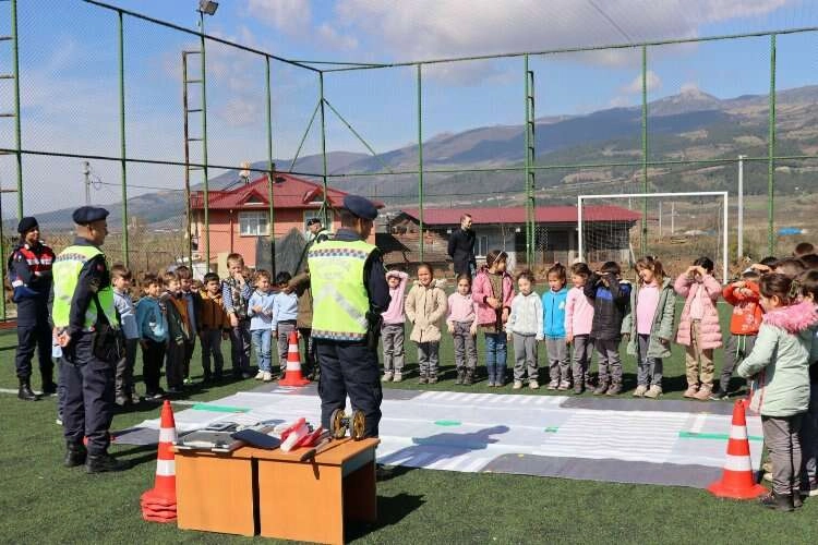 BİLECİK (İGFA) - Bilecik'in Osmaneli ilçesinde Hisarcık Beşevler İlkokul ve Ortaokulunda öğrenim gören miniklere jandarma tanıtıldı. 176 öğrencinin katıldığı bilgilendirme faaliyetinde Trafik Şube Müdürlüğü tarafından genel trafik kuralları,ve yayaların uyacakları trafik kuralları, Asayiş Şube Müdürlüğü tarafından güvenli internet kullanımı ve kişisel güvenlik, Aile Sosyal Hizmetler İl Müdürlüğü personeli tarafından mahremiyet eğitimi verildi.