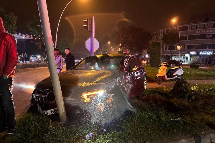 Çarpışmanın etkisiyle savrulan otomobil orta refüjteki ıkaz ışığı direğine vurarak durabildi.