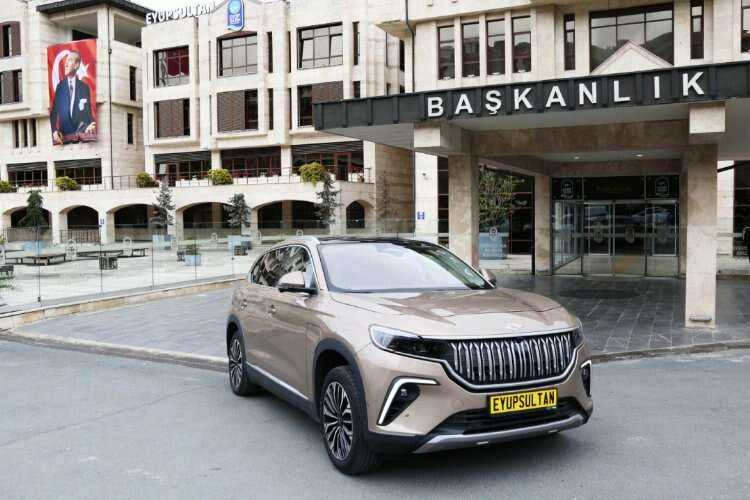 Başkan Deniz Köken, Togg’un Kapadokya’nın olağanüstü güzellikteki doğa harikası peri bacalarının toprak ve kum bejinden ilham alan “Kapadokya” rengine sahip , 34 ES 1071 plakalı aracını Eyüpsultan Belediye Başkanlık Binasından Kemerbugaz’a kadar sürdü.