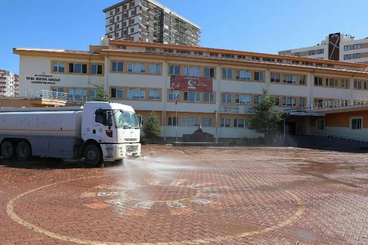 Yabani otların temizlenmesiyle başlayan çalışmalar kurumuş yaprakların süpürülmesi, basit onarımların yapılması ve okul bahçesinin yıkanmasıyla tamamlanarak kullanıma hazır hale getiriliyor. Toplamda 2 ekip halinde 15 personelin görev yaptığı temizlik işlemlerinde 2 arozöz, 2 süpürme aracı, dar alanlardaki otların biçilmesi için 2 adet misinalı çim biçme aracı ve 4 adet gazel süpürme aracı kullanılıyor.