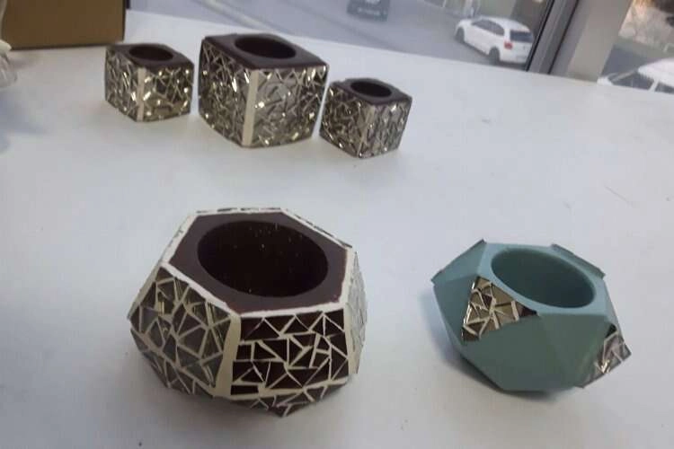 Girişimci kadınlar tarafından İZGİM Hediyelik Obje Atölyesi’nde üretilen mumluklar Mozaik Atölyesi’ndeki kadınlar tarafından boyanarak mozaik işlemesi tamamlanıyor.