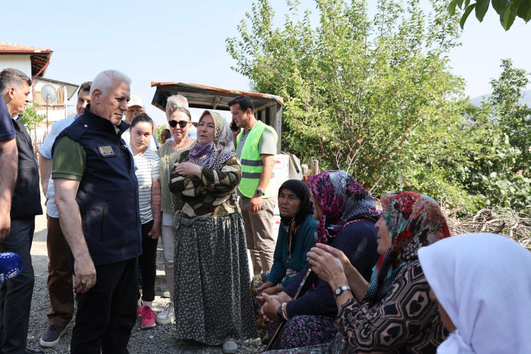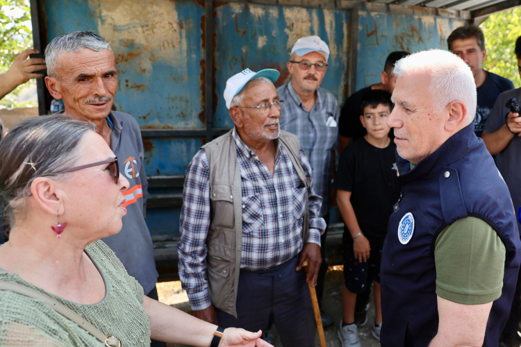Bursa’da 5 gün boyunca etkili olan orman yangınlarını söndürme ve soğutma çalışmaları tüm hızıyla sürerken, Harmancık ilçesindeki ormanlık alanda dumanların yeniden yükselmesi yürekleri ağızlara getirdi. Ekipler yangın bölgesine hızla ulaşarak alevleri söndürmek için harekete geçerken, Bursa Büyükşehir Belediye Başkanı Mustafa Bozbey de gelişmeleri Harmancık ilçesinde yerinden takip etti. Soğutma çalışmalarını yerinde gözlemleyerek ekiplerden bilgi alan Başkan Mustafa Bozbey, daha sonra Harmancık Belediye Başkanı Haşim Ali Arıkan ile birlikte yangından etkilenen Çamoğlu, Çakmak ve Dutluca köylerini ziyaret etti. Vatandaşlara geçmiş olsun dileklerini ileten Başkan Mustafa Bozbey, halkın ihtiyaç ve taleplerini birinci ağızdan dinledi.