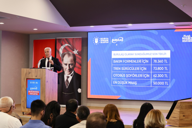 Bursa Büyükşehir Belediye Başkanı Mustafa Bozbey, BURULAŞ ile Demiryol-İş Sendikası arasında devam eden toplu iş sözleşmesi görüşmeleriyle ilgili kamuoyunda oluşan bilgi kirliliğini önlemek ve doğru bilgileri paylaşmak amacıyla önemli açıklamalarda bulundu. Dün itibariyle sendika tarafından greve çıkılacağı yönünde karar alındığını hatırlatan Başkan Bozbey, konuyu şeffaflık ilkesi gereği Bursa kamuoyunun da bilmesini istediklerini vurguladı. Çalışanların çok daha iyi şartlara kavuşmasının, her birinin yaşam standardının en iyi seviyede olmasının en büyük arzuları olduğunu belirten Başkan Bozbey, “Şunun da bilinmesini isterim. Çalışanlarımıza en iyi koşulları sağlamaya çalışırken, belediyemizin mali disiplini ve sürdürülebilirliği de bizim için vazgeçilmezdir. Her zaman söylüyoruz. Şeffafız, hesap verebilir bir anlayışa sahibiz. Şeffaf olmak demek, hiç çekinmeden her şeyi paylaşmak, kamuoyunun bilgisine sunmaktır. Başlangıçta sendika yönetimi yüzde 75 civarındaki bir artış oranıyla karşımıza geldi. Daha sonra görüşmelerde yüzde 54’e düştü. En son yüzde 47’de ısrar ederek grev kararını açıkladı. Bu taleplerin mevcut şartlarda gerçekçi talepler olmadığını ifade ediyoruz. Bu artış hayata geçirilirse, sadece BursaRay’da maliyet üzerinden hesaplanırsa bilet fiyatının yaklaşık 56 TL olması gerekir. Uzun hatlarda da yaklaşık 64 TL olması lazım” diye konuştu.