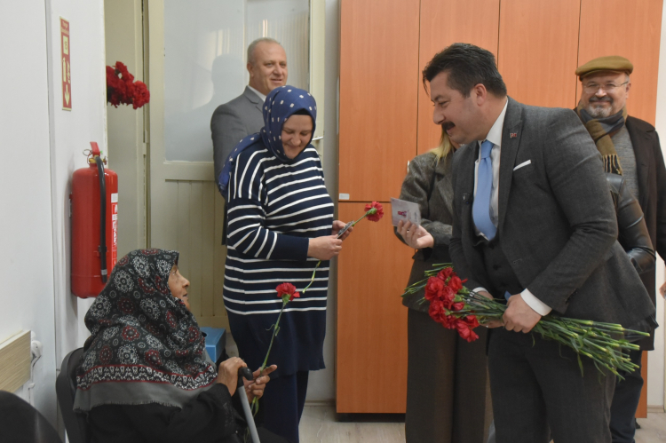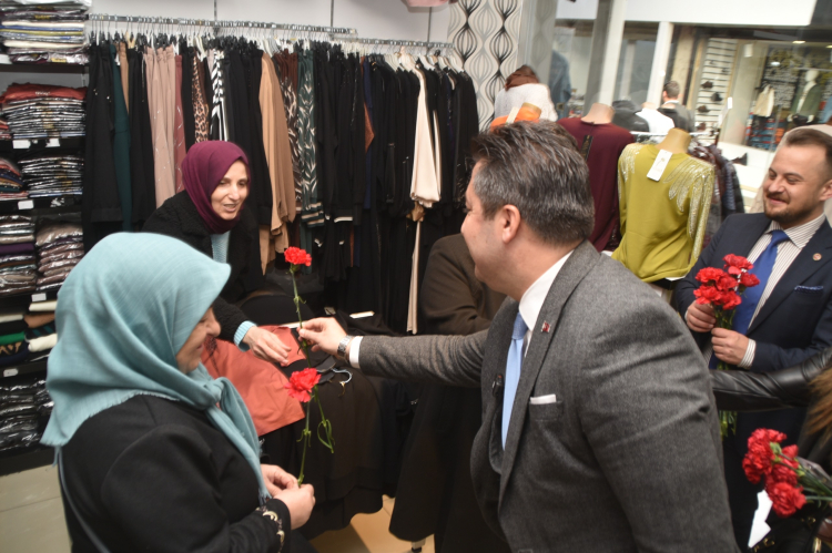 Yenişehir Belediye Başkanı Ercan Özel, 8 Mart Dünya Kadınlar Günü dolayısıyla kadınları ziyaret ederek karanfil hediye etti.