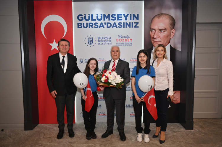 Bursa Büyükşehir Belediye Başkanı Mustafa Bozbey, 23 Nisan Ulusal Egemenlik ve Çocuk Bayramı dolayısıyla koltuğunu temsili olarak 7. sınıf öğrencileri Duru Tuna ve İlke Ormancı’ya devretti.