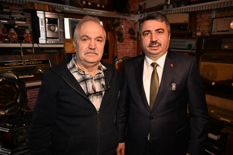 Yıldırım Belediye Başkanı Oktay Yılmaz, Bursa'da Yeşil Caddesi’ndeki atölyesinde 40 yıldır eski radyo ve gramofonları tamir edip çalışır hale getiren son usta 'Nostalji Doktoru' olarak tanınan Ahmet Ali Şağın’ın (63) misafiri oldu. Şağın ile sohbet eden Başkan Oktay Yılmaz, atölyede bulunan radyo, gramofon ve müzik dolaplarını inceledi.