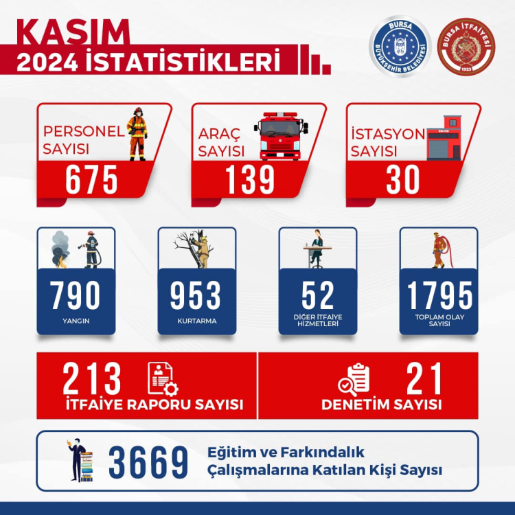 Bursa Büyükşehir Belediyesi, vatandaşın can ve mal güvenliğinin korunması bakımından hayati önem taşıyan itfaiye teşkilatını ekip, araç, ekipman ve yeni hizmet binalarıyla güçlendirmeye devam ederken, itfaiye personeli de gece gündüz demeden çalışmalarını sürdürüyor. Bursa’da 30 istasyonda 675 personel, 139 araçla hizmet veren Bursa Büyükşehir Belediyesi İtfaiye Daire Başkanlığına bağlı ekipler, Kasım ayında da birçok olaya müdahale etti. Ekipler, Kasım ayında 790 yangın, 953 kurtarma ve 52 diğer itfaiye hizmetleri olmak üzere 1795 olaya müdahale etti. Ayrıca 3669 kişiye eğitim verilirken, olaylarla alakalı 213 itfaiye raporu hazırlandı ve 21 denetim gerçekleştirildi.