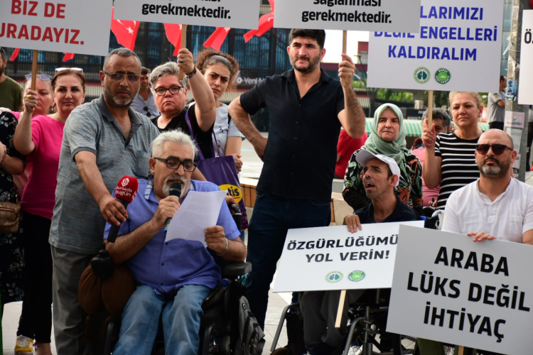 Kent Meydanı’ndan düzenlenen basın açıklamasında Engelliler Meclisi adına konuşan Ayhan Zenbilci, Maliye Bakanlığı’nın üzerinde çalıştığı vergi reformu paket taslağında ‘yoksul olduğunu belgeleyen’ engelli bireylerin Aile ve Sosyal Hizmetler Bakanlığı’na ‘araç alım desteği’ için başvuru yapabileceği ancak destekten faydalanacak olan bireylerin, engelli kaynaklı sosyal yardım desteklerinin kesileceği iddialarını hatırlattı. Kamuoyuna yansıyan bilgilerde iki ihtimal üzerinde durulduğunu belirten Zenbilci, “İlk ihtimal, istisnadan yararlanma süresinin 5 yıldan 10 yıla çıkarılması, taşıtların veraset yoluyla devredilmesiyle ilgili vergilerin mirasçılar tarafından ödenmesi ve her yıl yeniden değerleme oranında yükselen tutarın, bu oranın yarısı kadar arttırılması ihtimali. İkinci ihtimal de ÖTV Kanunu’ndaki istisnanın kaldırılması, teşvikin sosyal yardım şeklinde yapılması, engellilere getirilecek gelir şartı sunma zorunluluğu, satın alınacak taşıtların yerli olması ve bu esaslara bağlı olarak ilgili bakanlık tarafından araç alımında nakit desteği verileceği ihtimalidir” ifadelerini kullandı.