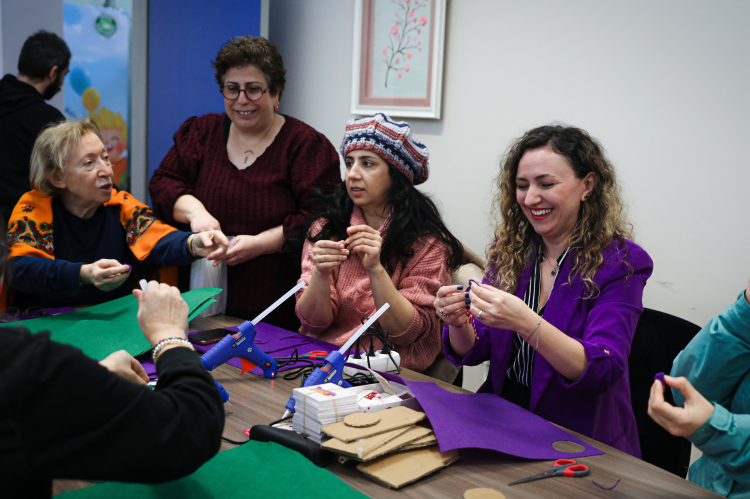 Bursa Kent Konseyi Kadın Meclisi’nin düzenlediği atölye çalışmasında, keçe kumaşlar, renkli iplikler, düğmeler ve süsleme malzemeleri kullanılarak birbirinden renkli ürünler hazırlandı. Kadınların dayanışma ve ortak üretim gücünü bir kez daha ortaya koyan ürünler, 8 Mart Pazar günü yapılacak yürüyüşte kullanılacak.