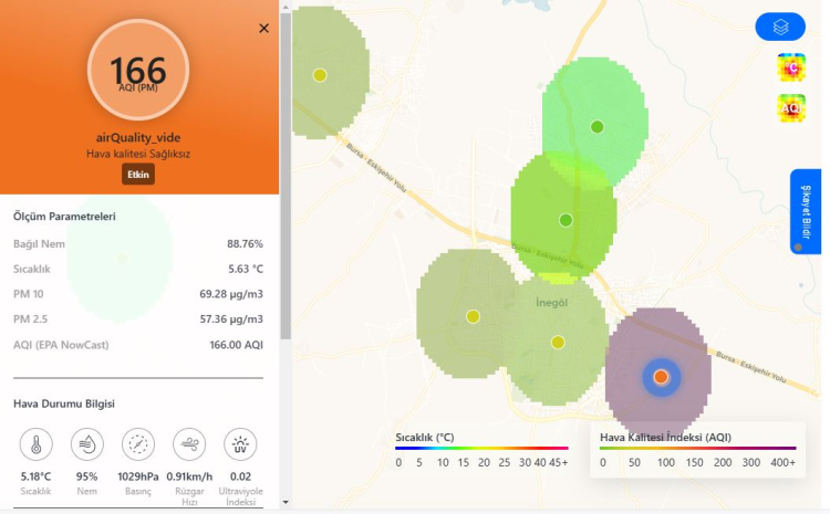 Elde edilen verilere göre, en sağlıksız hava kalitesi İnegöl’de tespit edilirken, Kestel ve Nilüfer Çalı civarında hava kalitesi hassas olarak görüldü. Mudanya-Güzelyalı civarı, Nilüfer-Kayapa çevresi, Beşevler-Odunluk civarı, Samanlı-Vakıf civarı, Gürsu, İnegöl merkez mahallelerinde hava kalitesi orta olarak ölçüldü. Yine İnegöl’ün kuzey bölgeleri ve Yeniceköy civarı, Çelebi Mehmet-Çınarönü civarı ile Bursa şehir merkezindeki mahallelerin ise hava kalitesi iyi olarak tespit edildi.
