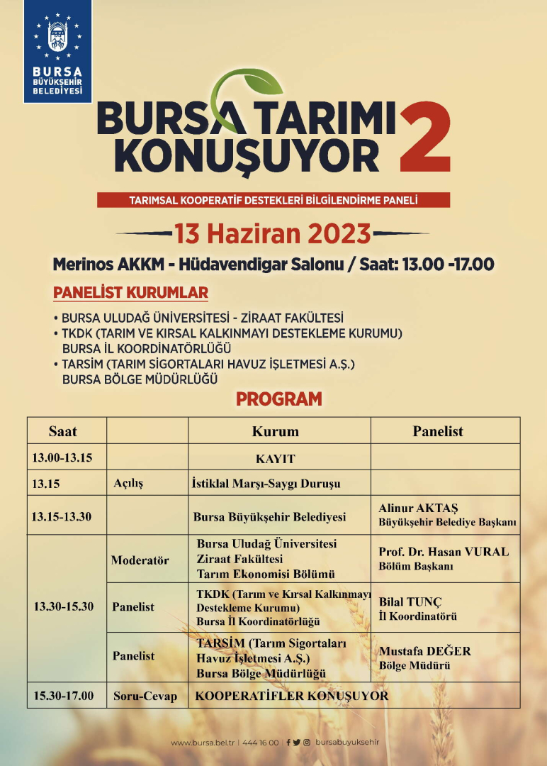 Bursa Büyükşehir Belediyesi tarafından ilki geçtiğimiz yıl düzenlenen ‘Tarımsal Destekler Bilgilendirme Paneli’nin ikincisi olan 'Bursa Tarımı Konuşuyor' programı 13 Haziran Salı günü yapılacak.