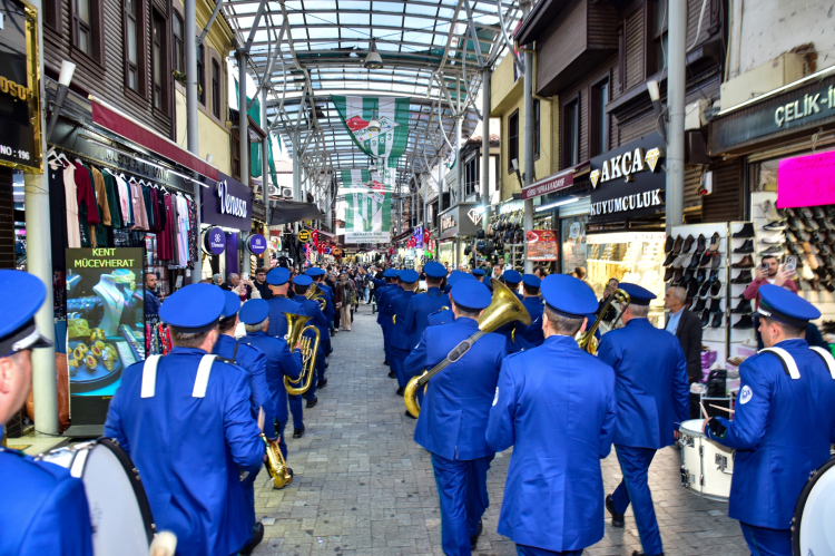 Bursa Büyükşehir Belediyesi Bandosu, Cumhuriyetin 102. yılı kutlamaları kapsamında Tarihi Hanlar Bölgesi’nde gerçekleştirdiği konserle vatandaşlara unutulmaz anlar yaşattı.