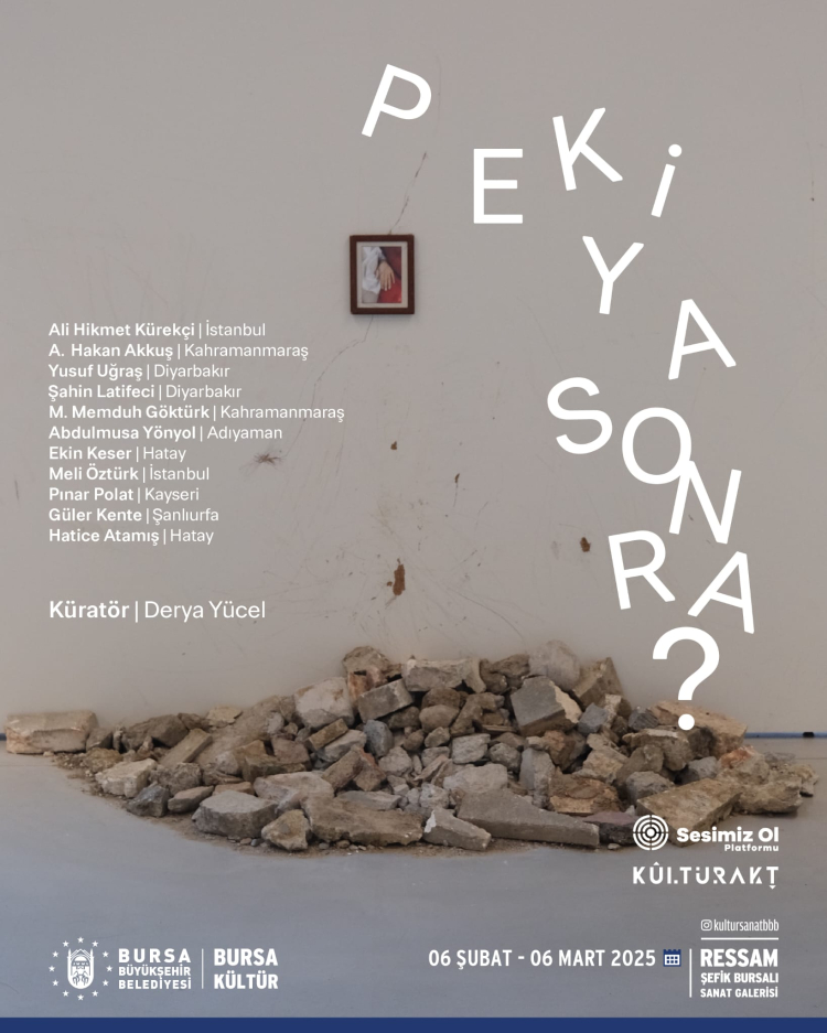 6 Şubat akşamı ziyarete açılacak olan “Peki Ya Sonra?” sergisi, Ali Hikmet Kürekçi-İstanbul, Ahmet Hakan Akkuş-Kahramanmaraş, Yusuf Ağraş-Diyarbakır, Şahin Latifeci-Diyarbakır, Muhammed Memduh Göktürk-Kahramanmaraş, Abdulmusa Yönyol-Adıyaman, Ekin Keser-Hatay, Meli Öztürk-İstanbul, Pınar Polat-Kayseri, Güler Kente-Şanlıurfa ve Hatice Atamış–Hatay isimli sanatçı ve eserlerini bir araya getiriyor.