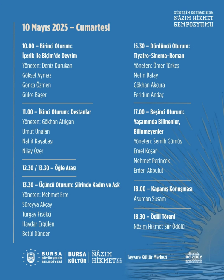 Bursa Büyükşehir Belediyesi tarafından ‘Nâzım Hikmet Yılı’ etkinlikleri kapsamında usta sanatçıyı anmak, anlamak ve anlatmak amacıyla ‘Güneşin Sofrasında Nâzım Hikmet Sempozyumu’ düzenleniyor. 9-10 Mayıs tarihleri arasında yapılacak olan sempozyumda, birbirinden değerli isimler tarafından 'Mavi Gözlü Dev'in eserleri konuşulacak.