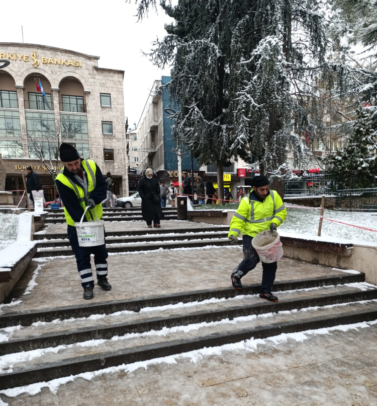 Öte yandan Park ve Bahçeler Dairesi Başkanlığı Kent Estetiği Şube Müdürlüğü ekipleri de buzlanmaya karşı tuzlama, solüsyon ve küreme çalışmalarını tüm hızıyla sürdürüyor. Hafta içi 200 personelle çalışmalara katılan Kent Estetiği Şube Müdürlüğü, hafta sonu toplam 30 kişilik 8 ayrı ekiple yaya hareketliliğinin yoğun olduğu cadde, meydan, bulvar, altgeçit, üstgeçit hastane girişleri, kaldırımlar ve ihbar gelen noktalar başta olmak üzere 73 farklı noktada buzlanma olaylarına anında müdahale ediyor. Acil müdahale mangası gibi çalışan ekipler, 153 İhbar Hattı üzerinden gelen şikayetlere hızla yanıt vererek çalışmalara destek sağlıyor.