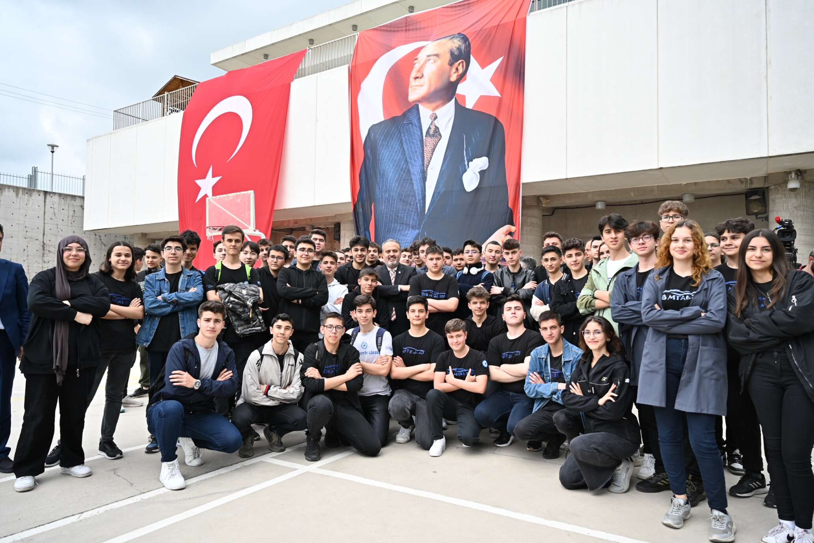 Türkiye’nin 60 yıllık hayalinin Togg ile gerçek olduğunu hatırlatan Büyükşehir Belediye Başkanı Alinur Aktaş, “Ne kadar gururlansak az. 60 yıllık hayalimiz Togg artık sahalarda, yollarda geziyor. Bu lisemiz ülkemizin önemli liselerinden biri. Geçen hafta 6. OTOFEST’e gelmiştik. Çocuklarımızın heyecanına ortak olduk. Bana Togg beklediklerini ifade ettiler. Ben de Büyükşehir’e alacağımız Togg’u ilk olarak buraya getireceğimin sözünü vermiştim. Aracımız geldi ve evlatlarımızla buluşturduk. Geleceğin otomotiv markalarının yöneticisi olacak, onun fikir altyapısını oluşturacak, onunla alakalı önemli süreçleri sevk ve idare edecek olan gençlerimizin heyecanına şahit olduk. Onlara kolaylıklar ve başarılar diliyorum. Gerçekten yüksek teknolojinin çok konuşulduğu, ülkemiz için olmazsa olmazlardan olan ortam içinde gençlerimizin bu heyecanına şahit olmak büyük mutluluk” diye konuştu.