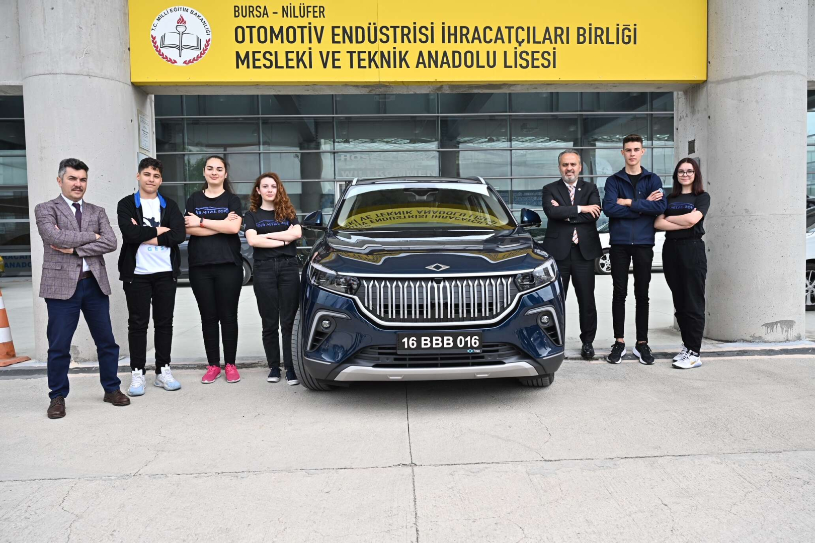 Bursa’nın Gemlik ilçesinde üretileceği gündeme geldiği ilk günden, aracın yollara çıktığı günümüze kadar kentte büyük heyecan uyandıran Türkiye’nin yerli ve milli gururu Togg, 16 BBB 016 plaka numarası ile Bursa Büyükşehir Belediyesi envanterine de girdi. Otomotiv sektörünün nitelikli iş gücü ihtiyacını karşılamak üzere Bursa’da kurulan Türkiye'nin ilk otomotiv lisesi, Otomotiv Endüstrisi İhracatçıları Birliği Mesleki ve Teknik Anadolu Lisesi’nde geçtiğimiz hafta düzenlenen festivale katılan Büyükşehir Belediye Başkanı Alinur Aktaş, Büyükşehir’e gelecek Togg’u ilk olarak bu okula getireceğine dair öğrencilere söz vermişti. Başkan Aktaş, dün gelen Togg ile birlikte ilk yolculuğunu da geleceğin otomotivcilerini yetiştiren bu okula yaptı. Öğrenciler tarafından okulun girişinde Türk Bayrakları ile karşılanan Togg, büyük heyecan uyandırdı.